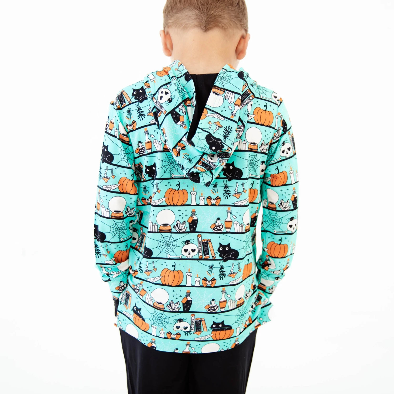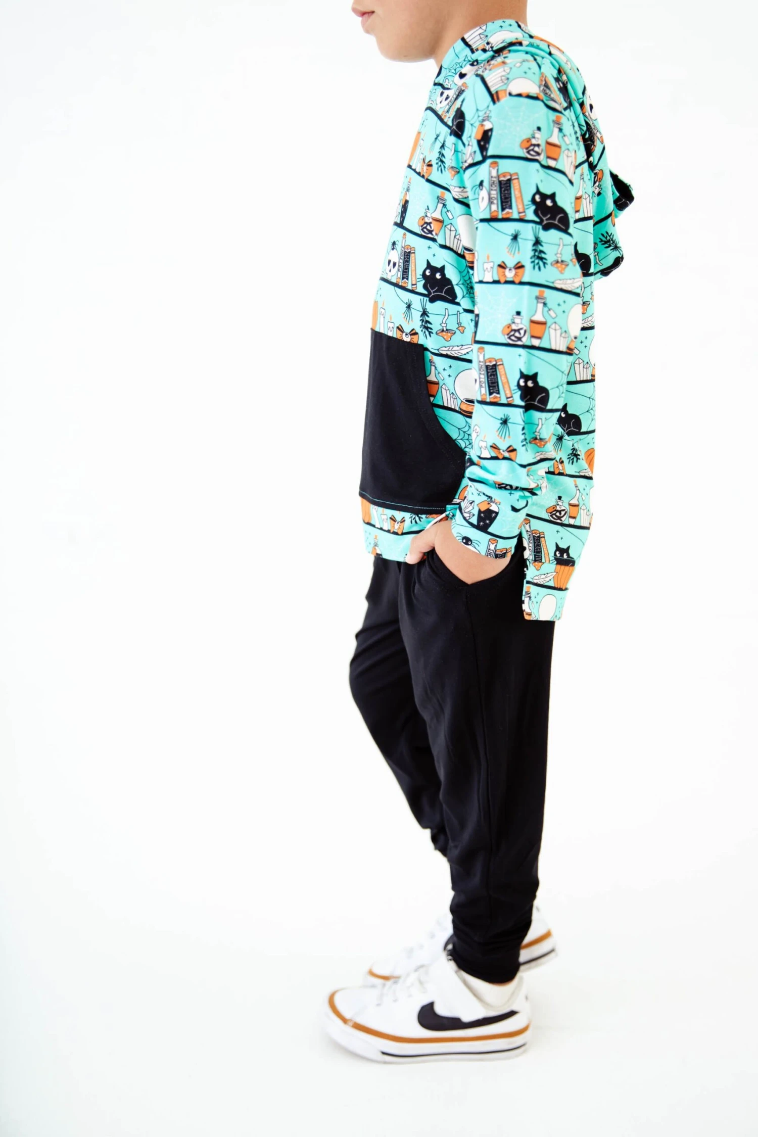 Welcome to Spooky Season… this collection has everything you could imagine seeing on a trip to the magic shop! Black cats, spiderwebs, magic potions and more! Made with the same same soft and stretchy bamboo viscose as our convertible footies, this hoodie and jogger set is the perfect daywear set for your favorite toddler or big kid! These comfortable solid jogger pants feature pockets and an adjustable drawstring. The split hem hoodie is designed with a front pouch and a little extra length on the backside, for a super comfy fit and ultra cool look.