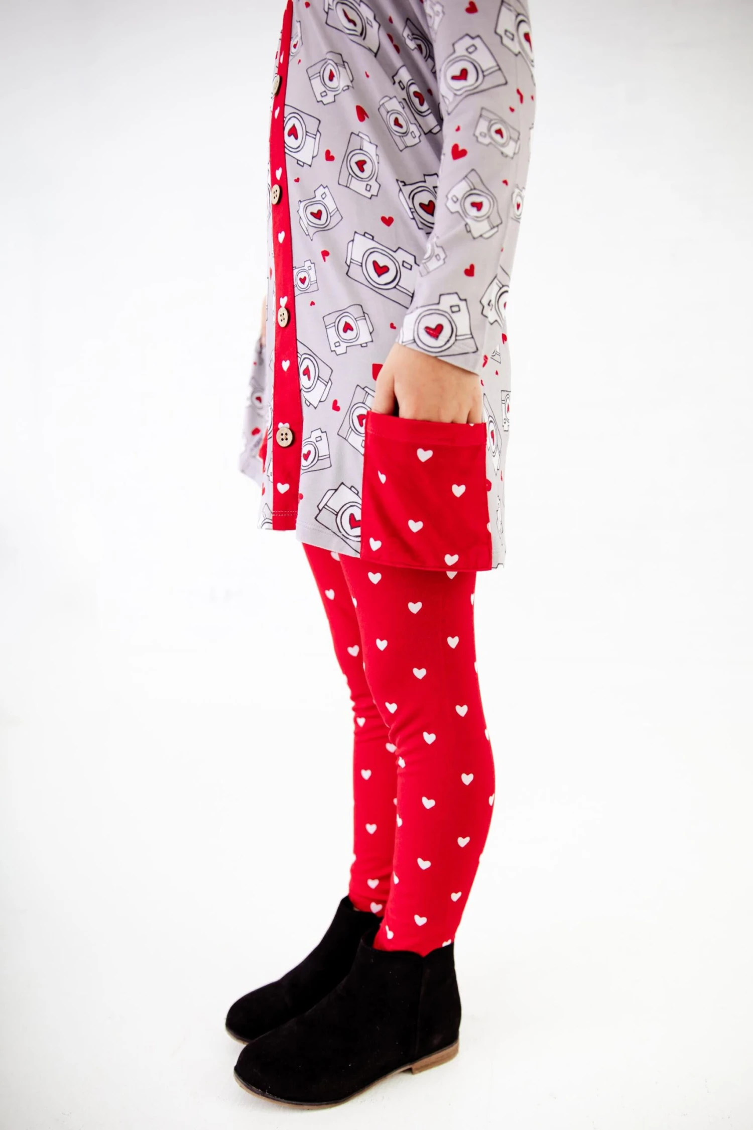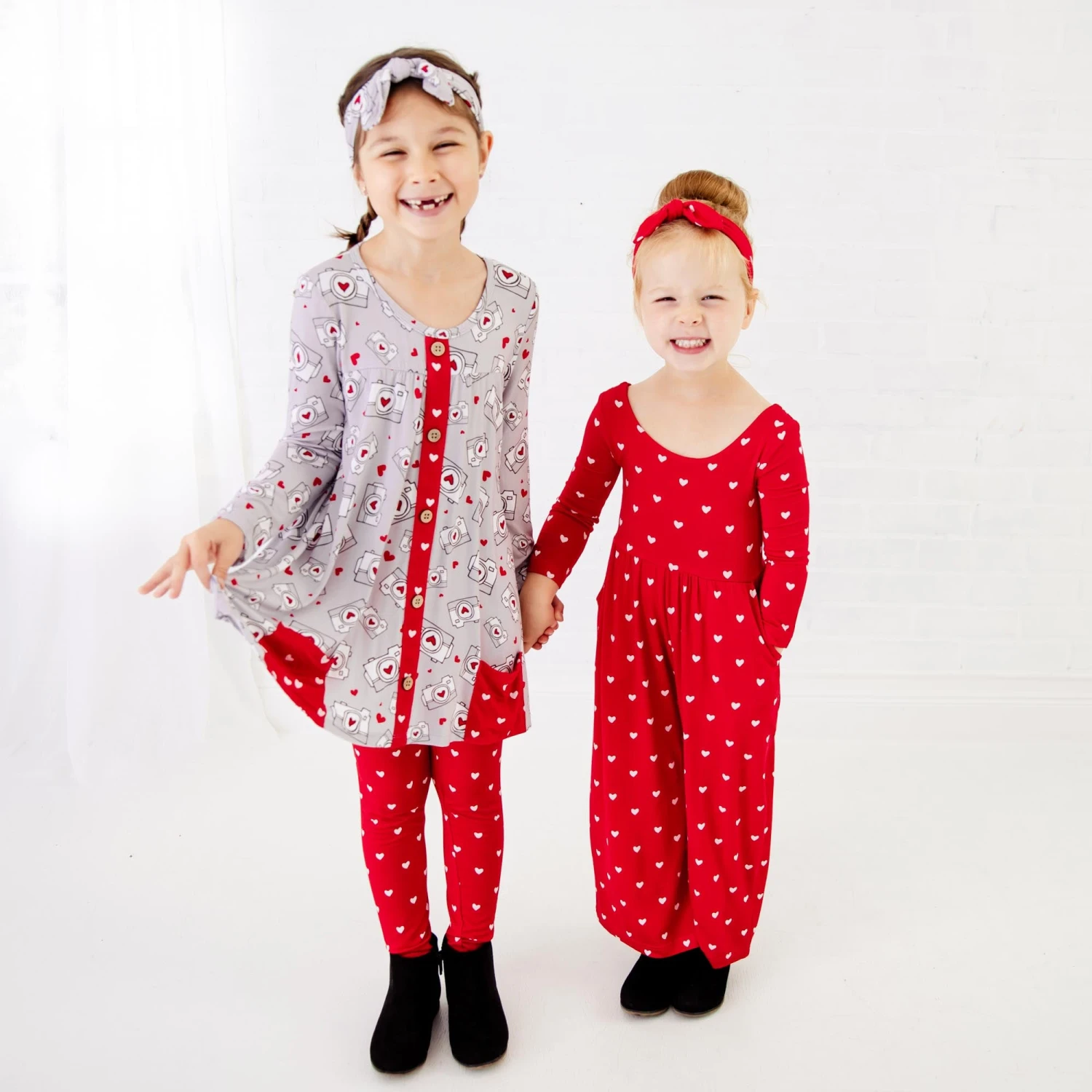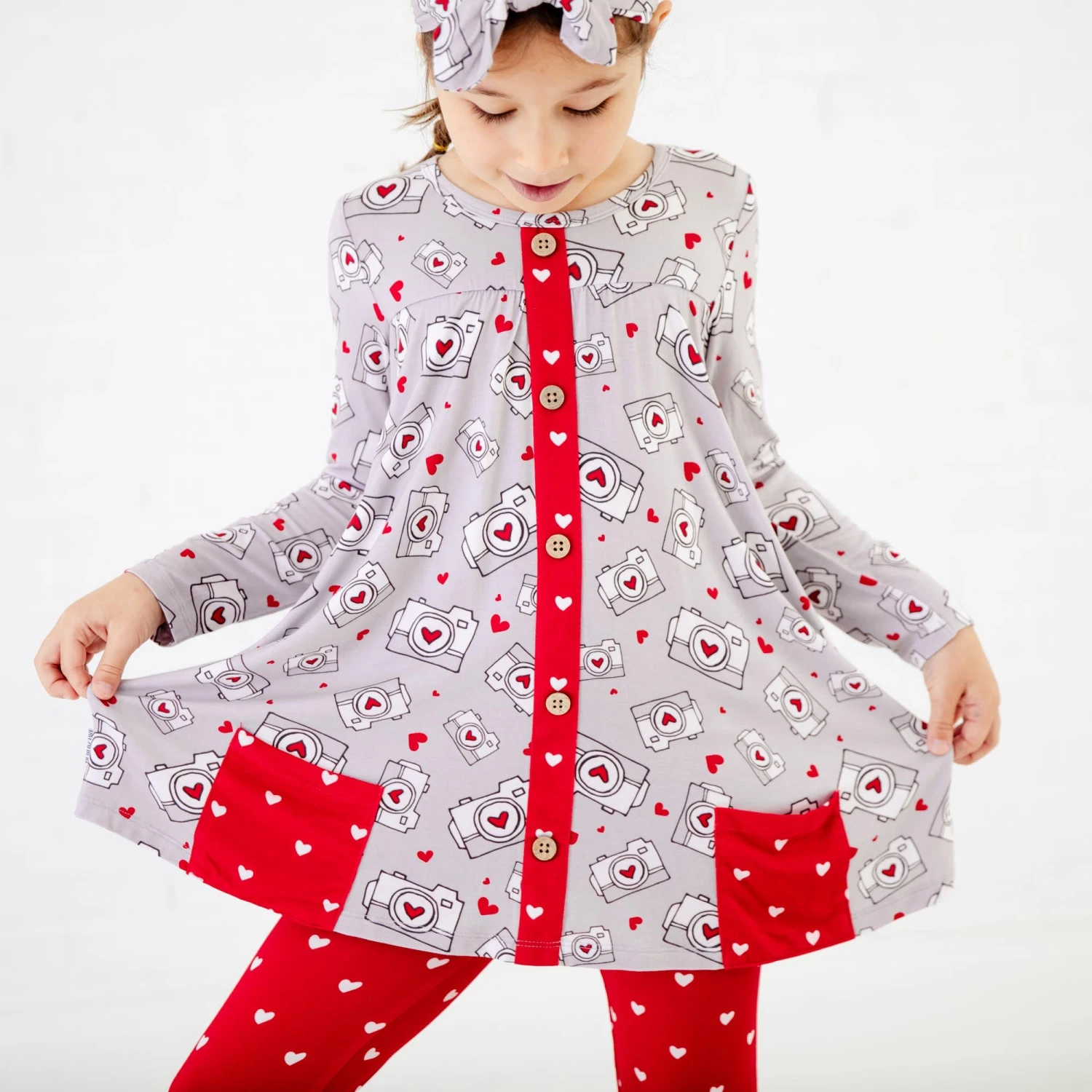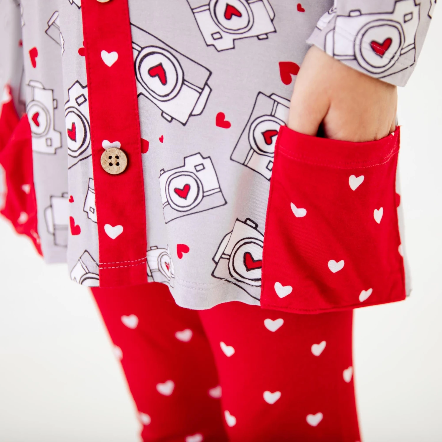 These vintage cameras on a soft grey background with a pop of red hearts, make this a fun collection for valentine’s day and beyond! Contrasting Red Heart Pockets and Leggings add an extra cute factor! Made with the same soft and stretchy bamboo viscose as our convertible footies, this pocket tunic and pants set is the perfect daywear set for your favorite toddler or big kid! These comfortable leggings feature an elastic waistband and an ultra-smooth fit. The pocket tunic features contrasting pockets and the cutest button detail down the bodice for that extra sweet factor!