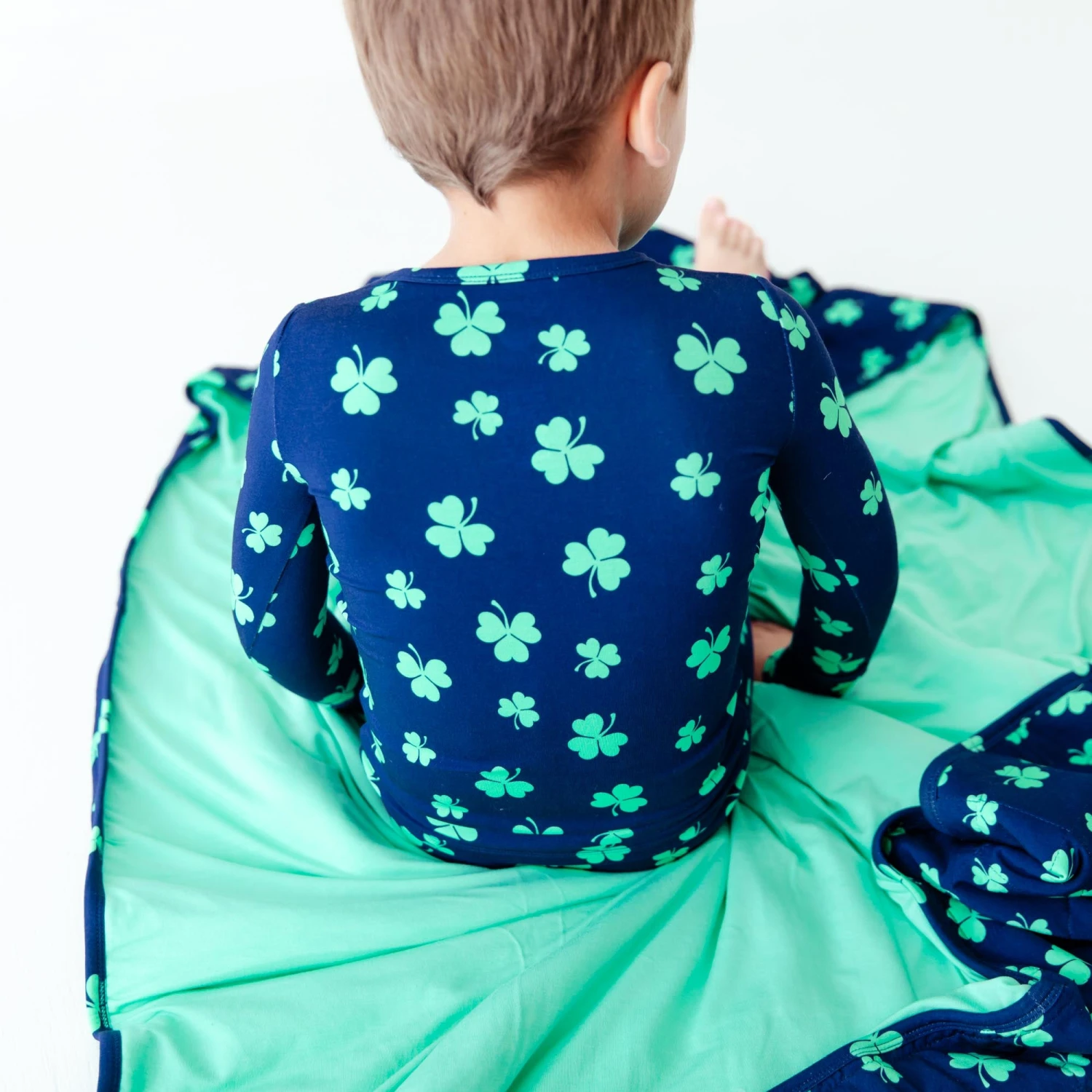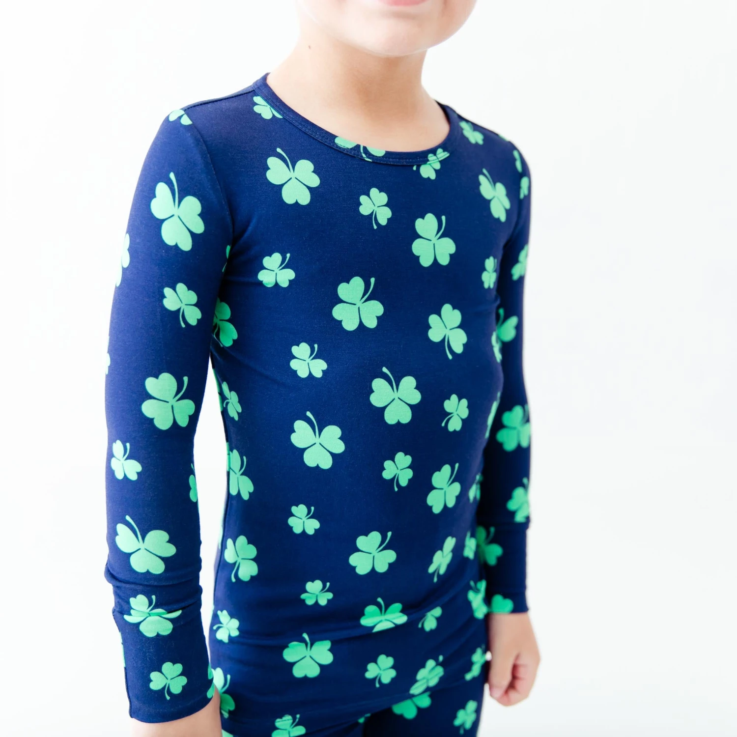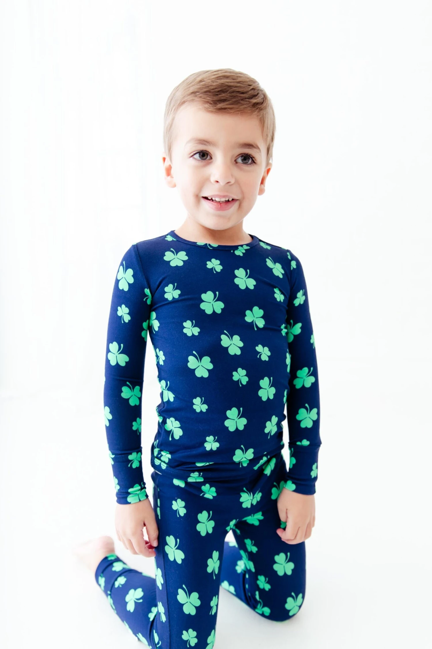The perfect St. Patrick’s Day pajamas with sharp green shamrocks on a deep blue background! Made with the same same soft and stretchy bamboo viscose as our convertible footies, these two piece jamms are perfect for your favorite toddler or big kid! Featuring long sleeve and pants and an elastic waist band, our jamms are designed with a little extra length, which means they fit longer than your average pajamas!