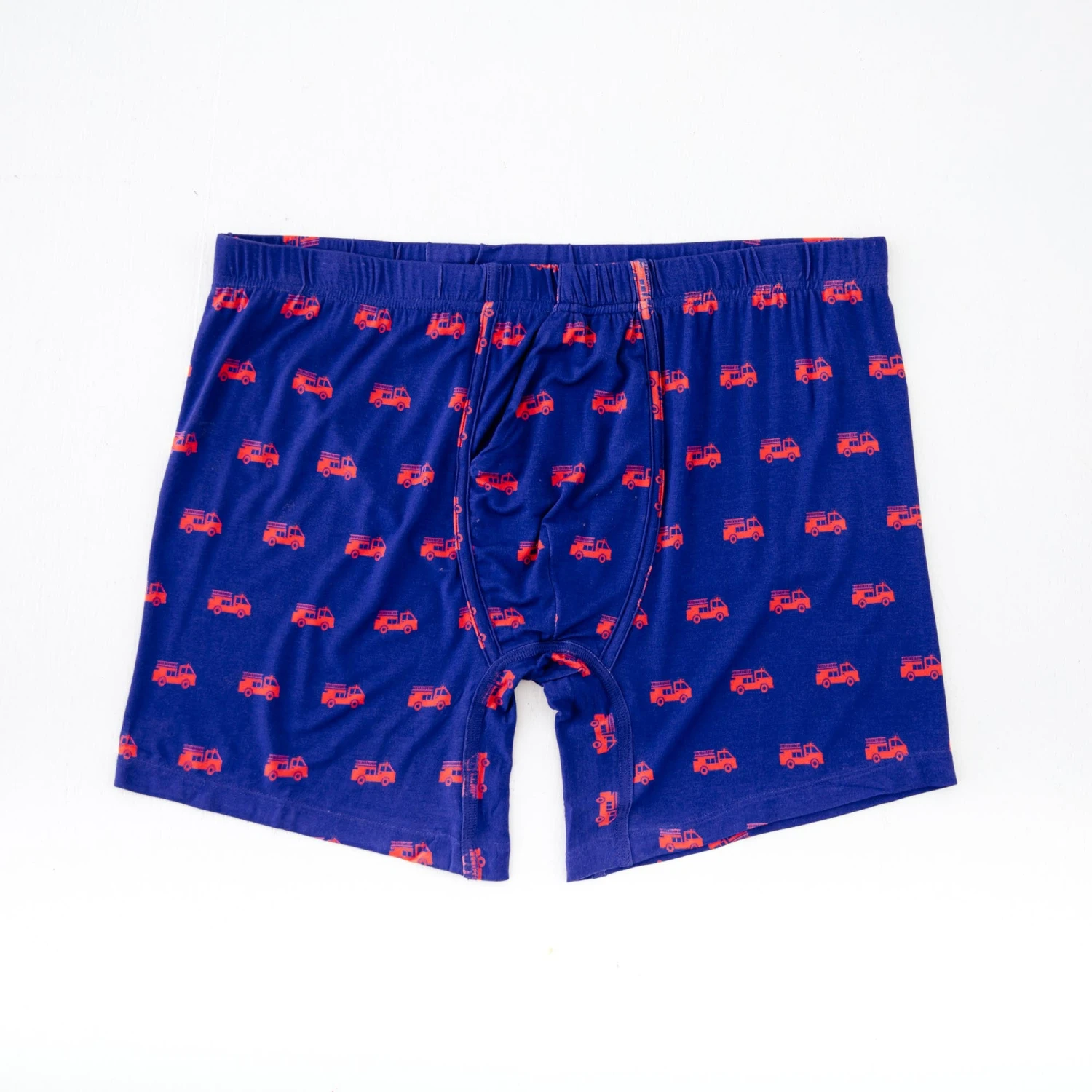 One of our most loved prints is back in an all new color! This collection features red firetrucks on a deep navy background! Made with the same soft and stretchy bamboo viscose as our children’s jamms, these men’s boxer brief underwear are ready to keep you comfortable and cool all day long! Our boxer briefs feature a thick, no roll elastic waist band, generous pouch, and a strong and supportive, yet soft fit. These men’s boxer briefs are the ultimate in comfort!