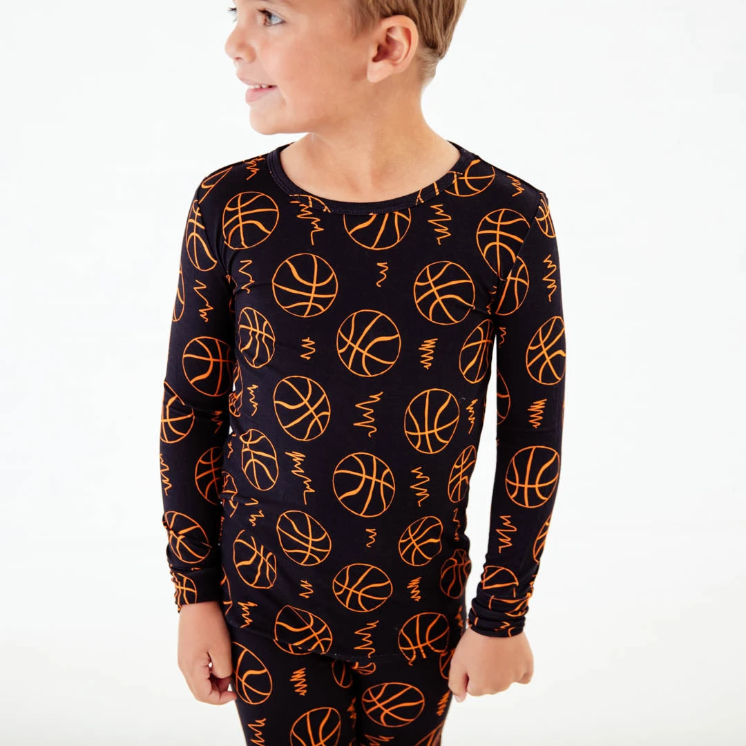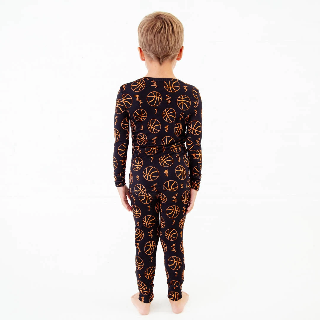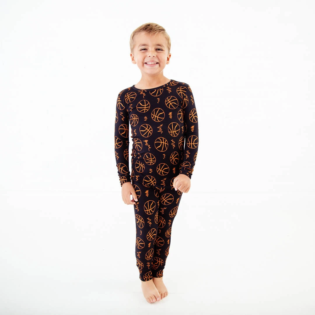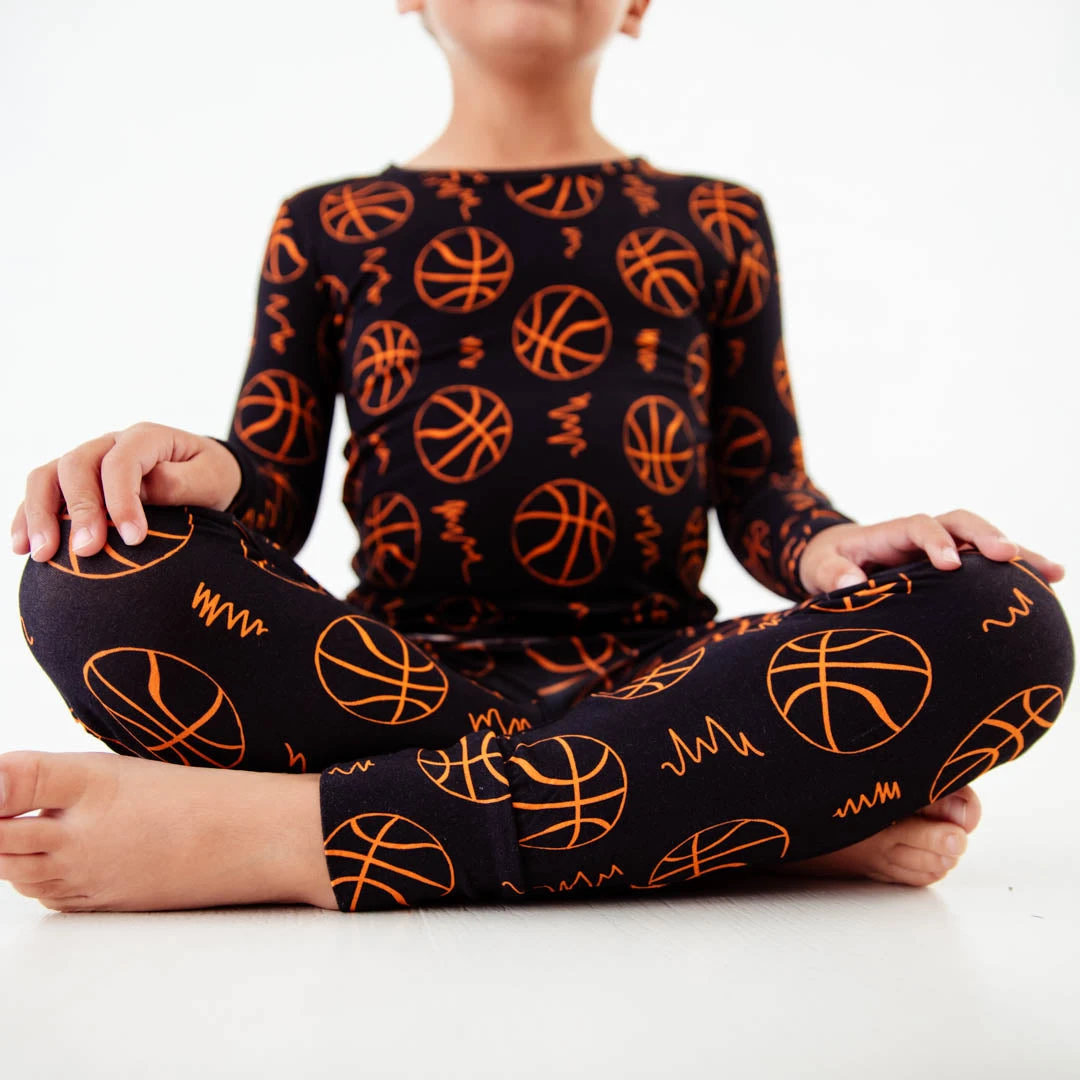 Dribble, shoot, in the hoop! Life is definitely better on the basketball court and this sporty collection has you ready! Made with the same soft and stretchy bamboo viscose as our convertible footies, these two piece jamms are perfect for your favorite toddler or big kid! Featuring long sleeve and pants and an elastic waist band, our jamms are designed with a little extra length, which means they fit longer than your average pajamas!
