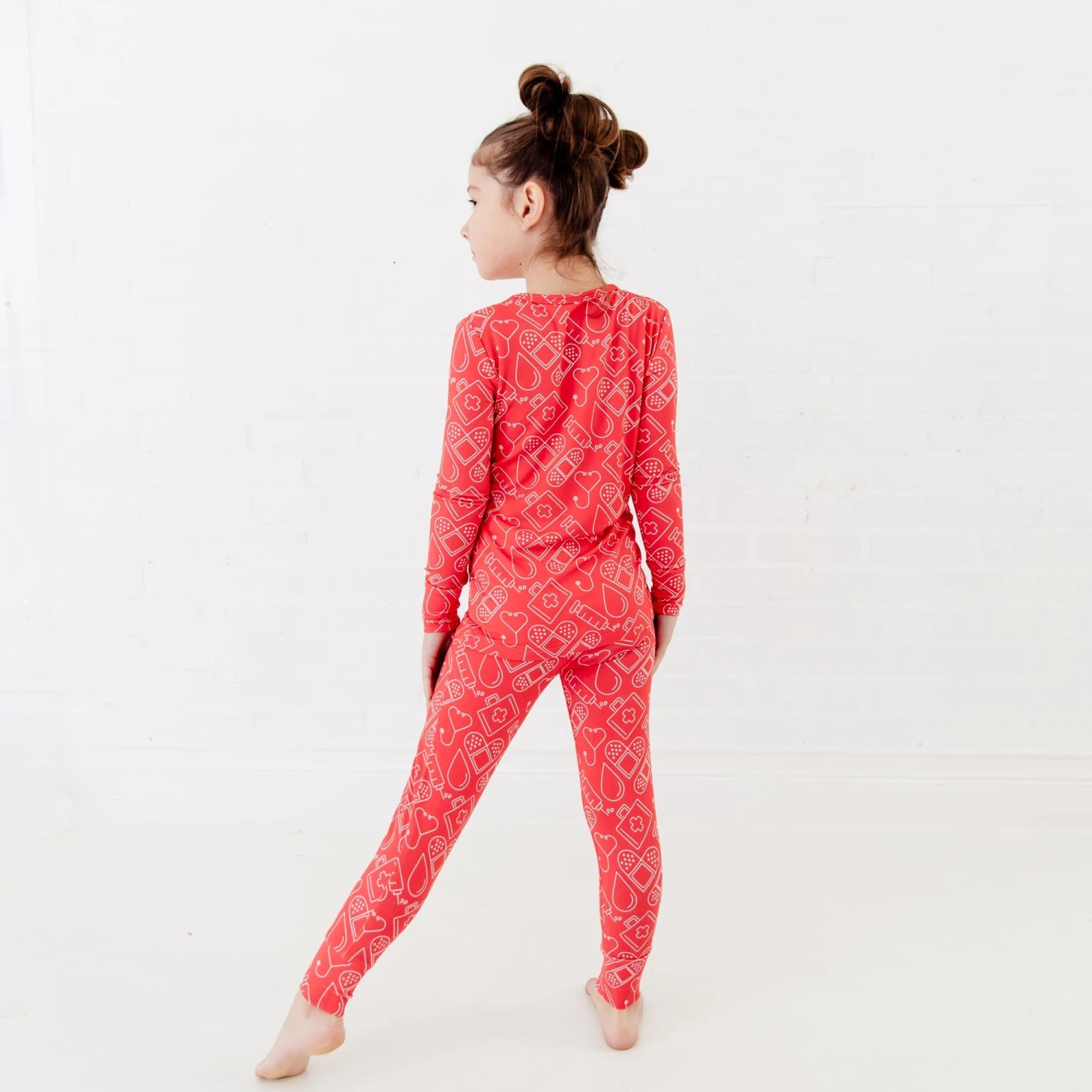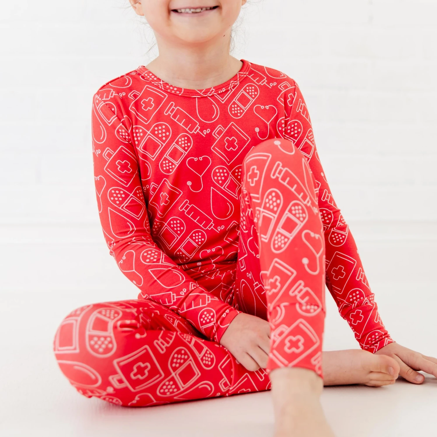 This collection is perfect for all the nurse and medical families! Made with the same same soft and stretchy bamboo viscose as our convertible footies, these two piece jamms are perfect for your favorite toddler or big kid! Featuring long sleeve and pants and an elastic waist band, our jamms are designed with a little extra length, which means they fit longer than your average pajamas!