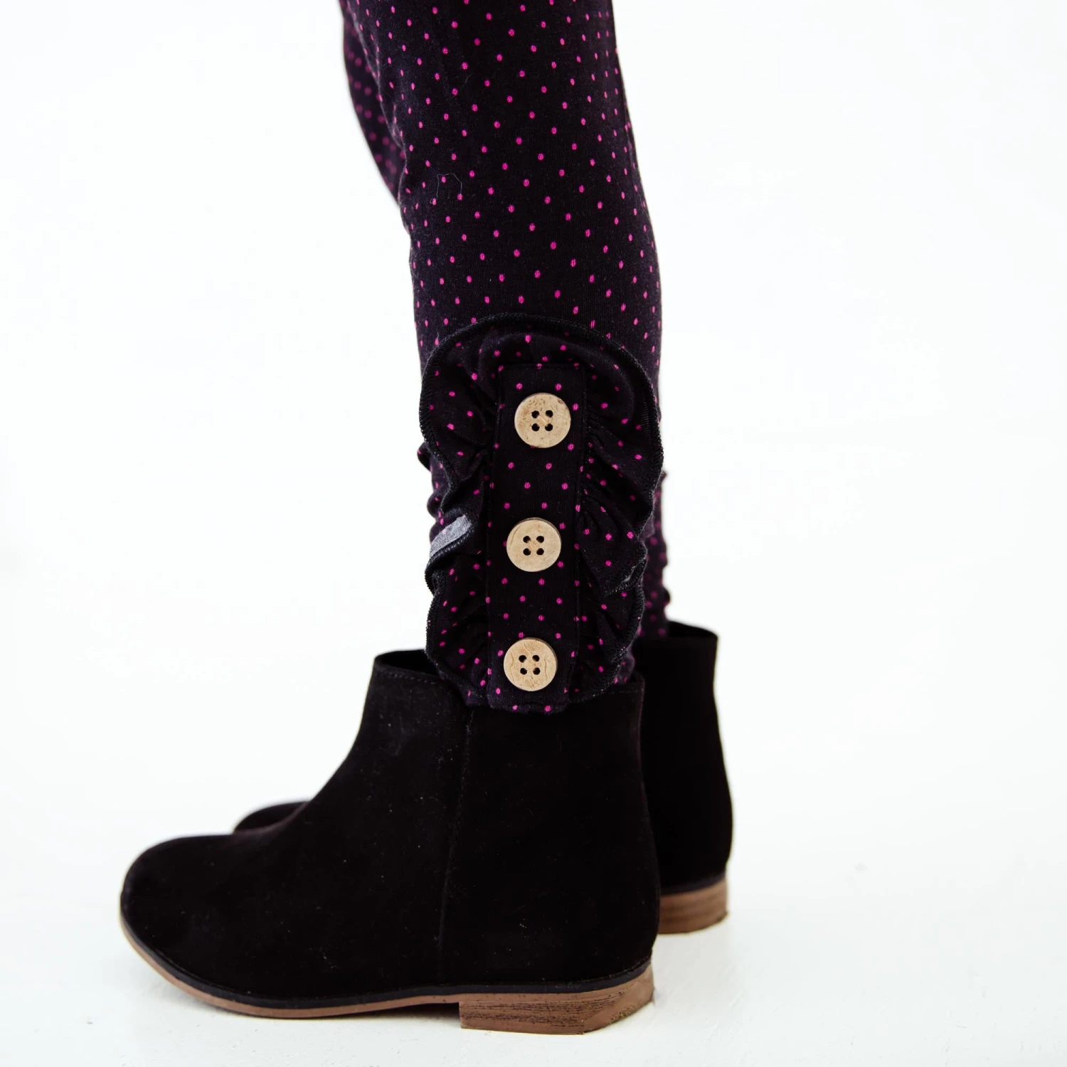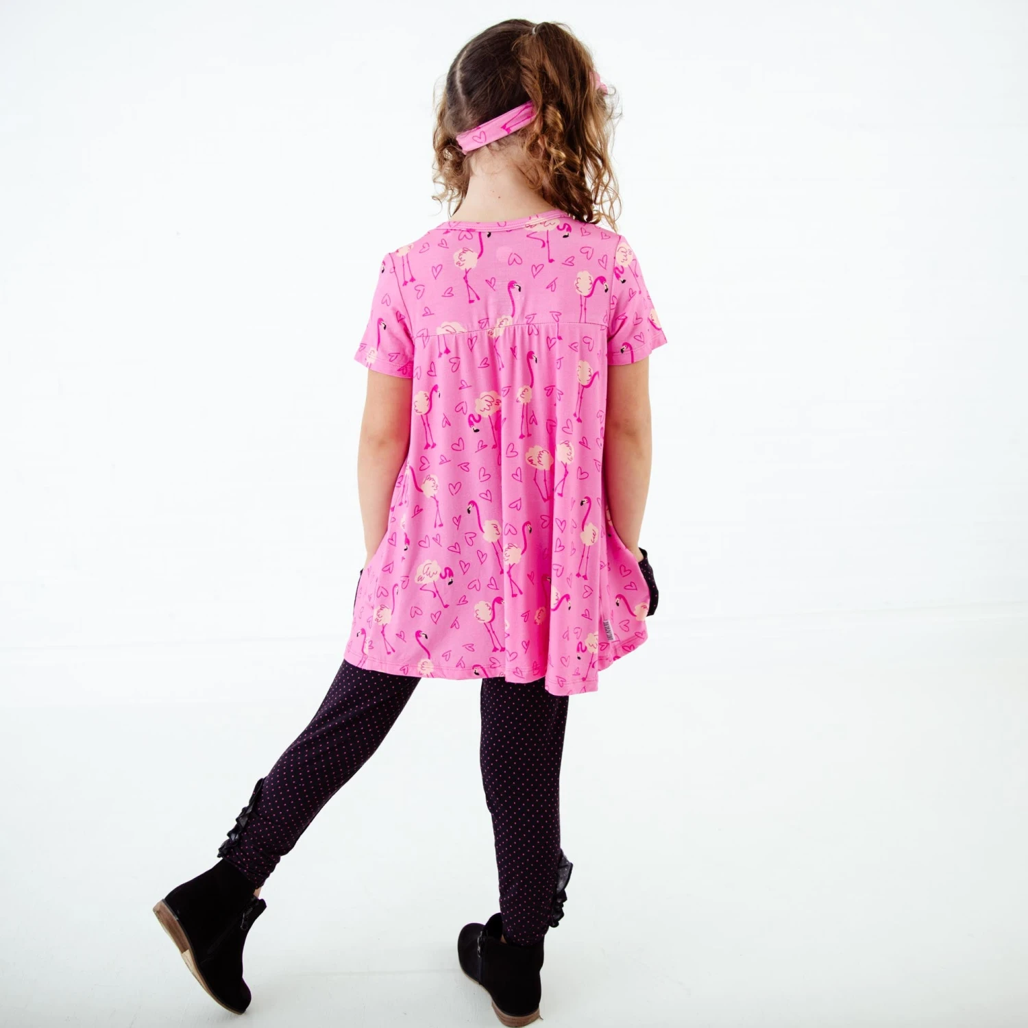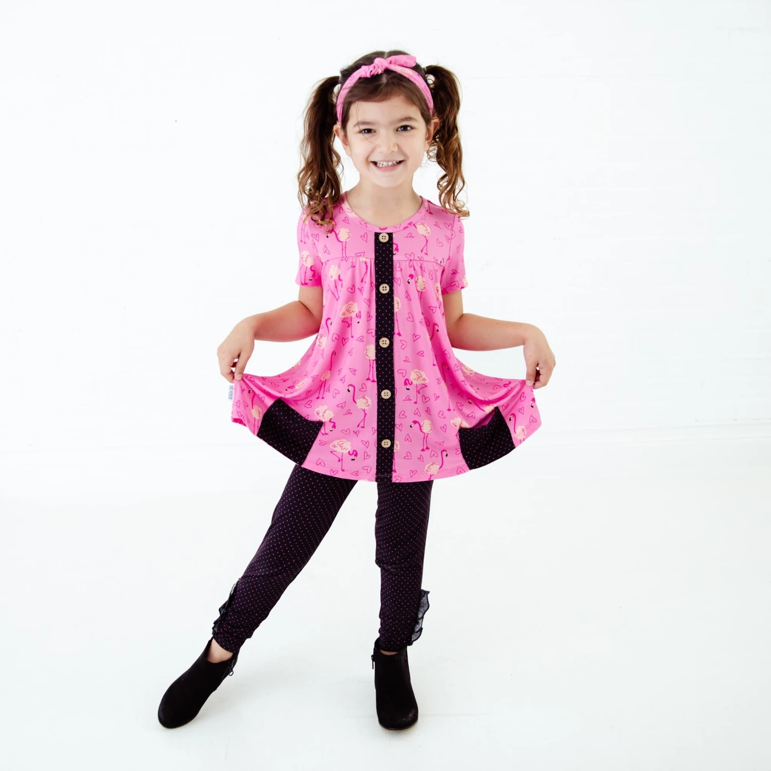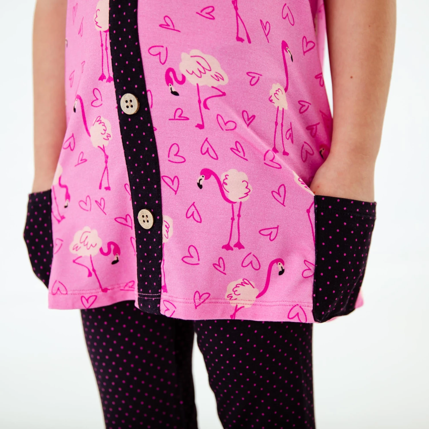 This bright pink collection is perfect for Valentine’s Day and beyond! Featuring darling flamingos and hearts! Made with the same soft and stretchy bamboo viscose as our convertible footies, this pocket tunic and pants set is the perfect daywear set for your favorite toddler or big kid! These comfortable leggings feature an elastic waistband, an ultra-smooth fit, and adorable rouching on the bottom with buttons! The pocket tunic features contrasting pockets and the cutest button detail down the bodice for that extra sweet factor!