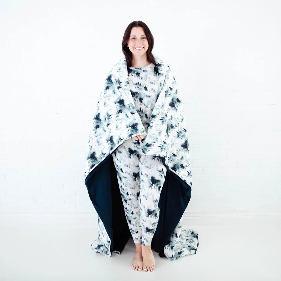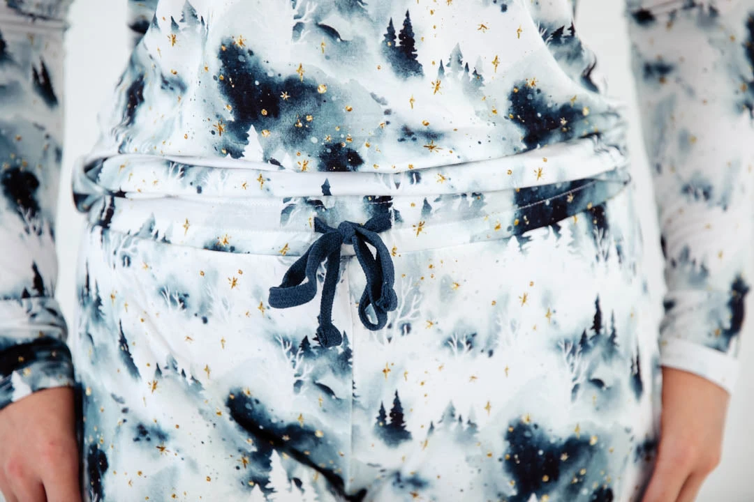 Featuring wintery snow capped trees with a touch of gold stars, this best selling collection is back! Made with the same soft and stretchy bamboo viscose as our children’s jamms, these two piece women’s loungewear sets are perfect for year round wear! Featuring a long sleeve crew neck top, this sleep shirt is the perfect ultra-comfortable addition to your closet. Our jogger style pants feature a thick elastic waist band, with an adjustable drawstring. Perfect for matching your little ones!