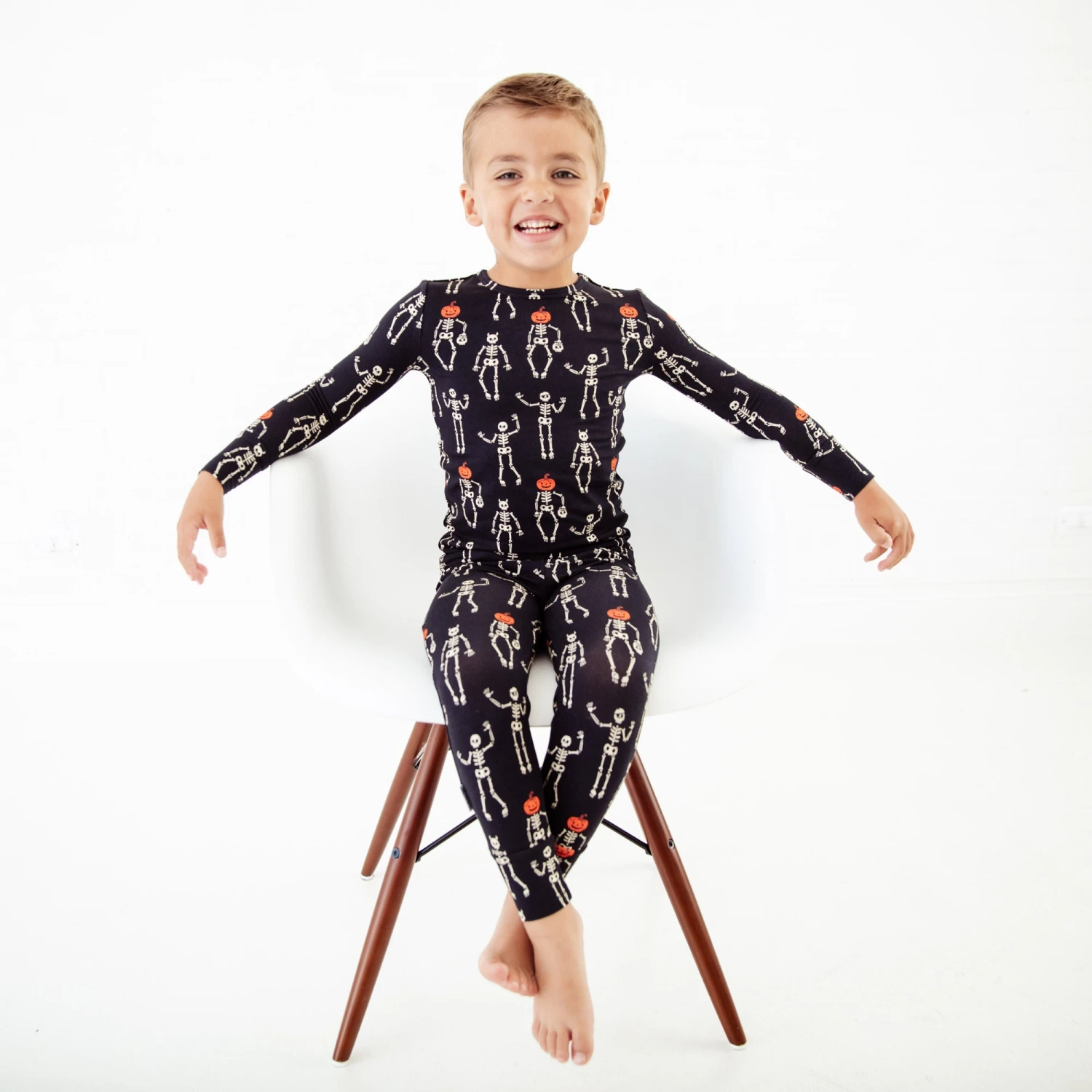 Welcome to Spooky Season… these pumpkin head skeletons look like they are skele-tons of fun! Made with the same soft and stretchy bamboo viscose as our convertible footies, these two piece jamms are perfect for your favorite toddler or big kid! Featuring long sleeve and pants and an elastic waist band, our jamms are designed with a little extra length, which means they fit longer than your average pajamas!