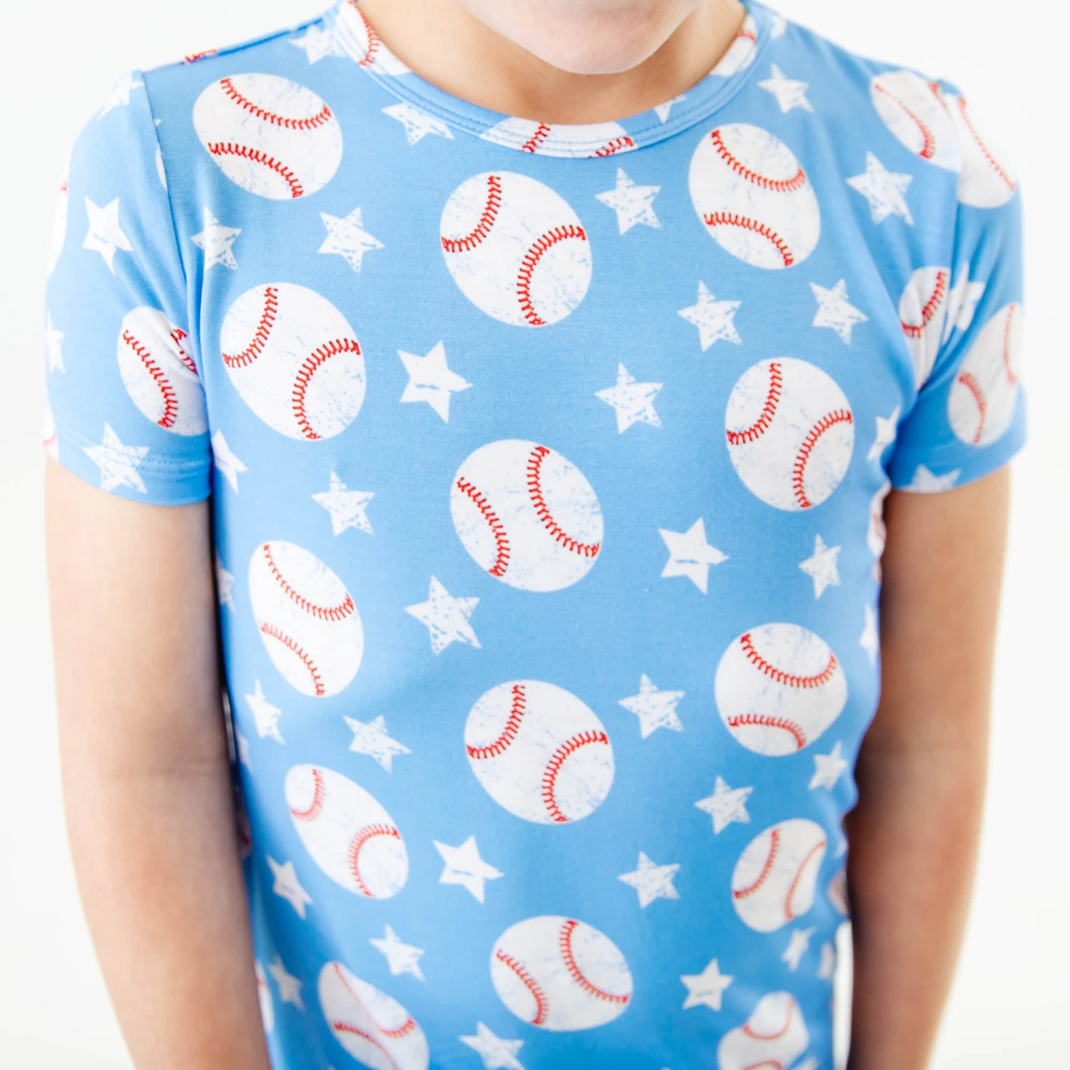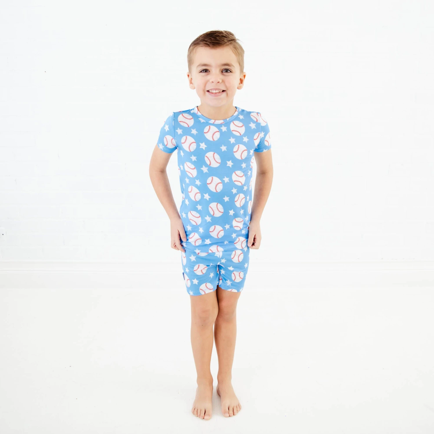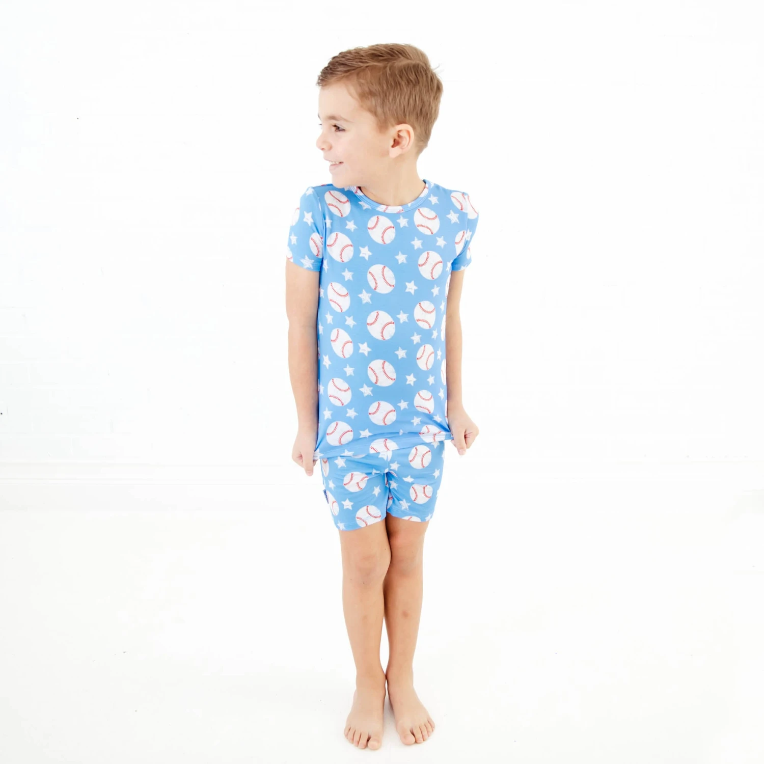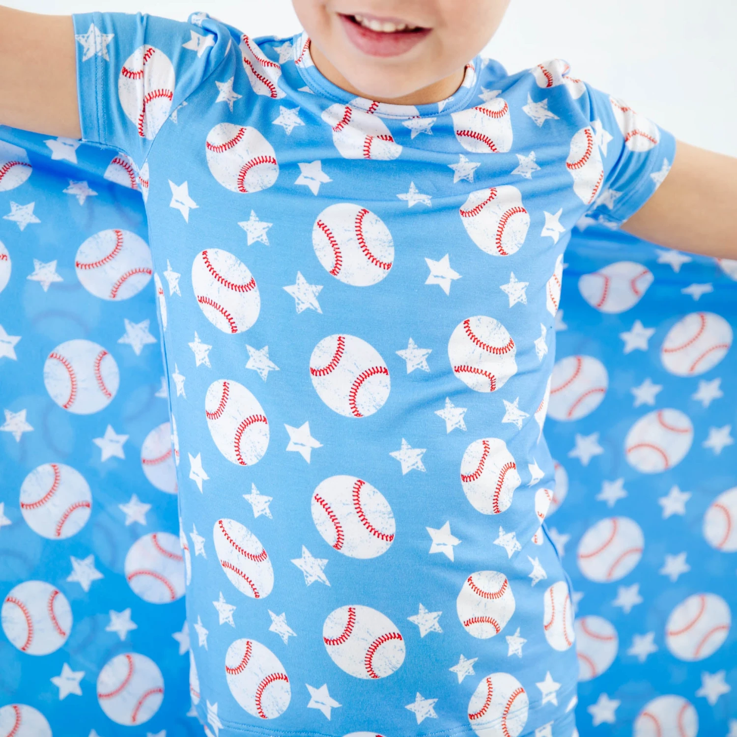 Take me out to the ball game! Featuring baseballs and stars on a bright sky blue background, this collection will have you ready for the 1st inning! Made with the same soft and stretchy bamboo viscose as our convertible footies, these two piece jamms are perfect for your favorite toddler or big kid! Featuring short sleeves and shorts and an elastic waist band, our jamms are designed with a little extra length, which means they fit longer than your average pajamas!