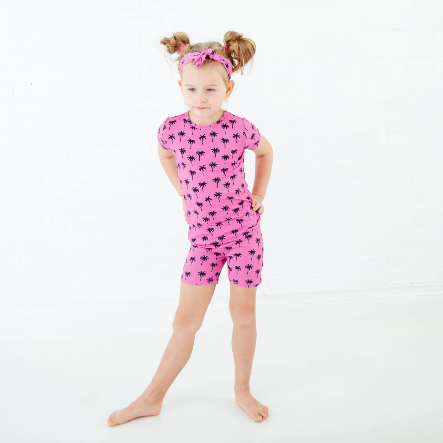 This hot pink print with navy palm trees is giving off a total beach vibe! Made with the same soft and stretchy bamboo viscose as our convertible footies, these two piece jamms are perfect for your favorite toddler or big kid! Featuring short sleeves and shorts and an elastic waist band, our jamms are designed with a little extra length, which means they fit longer than your average pajamas!